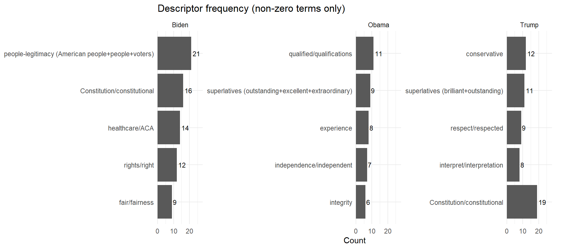 Thus, whereas Obama focused most on a nominee’s qualifications to be a justice, Biden and Trump were more focused on what the nominee would do as a justice: whether in adhering to an originalist judicial philosophy (in Trump’s case) or advancing democratic legitimacy (in Biden’s case).
