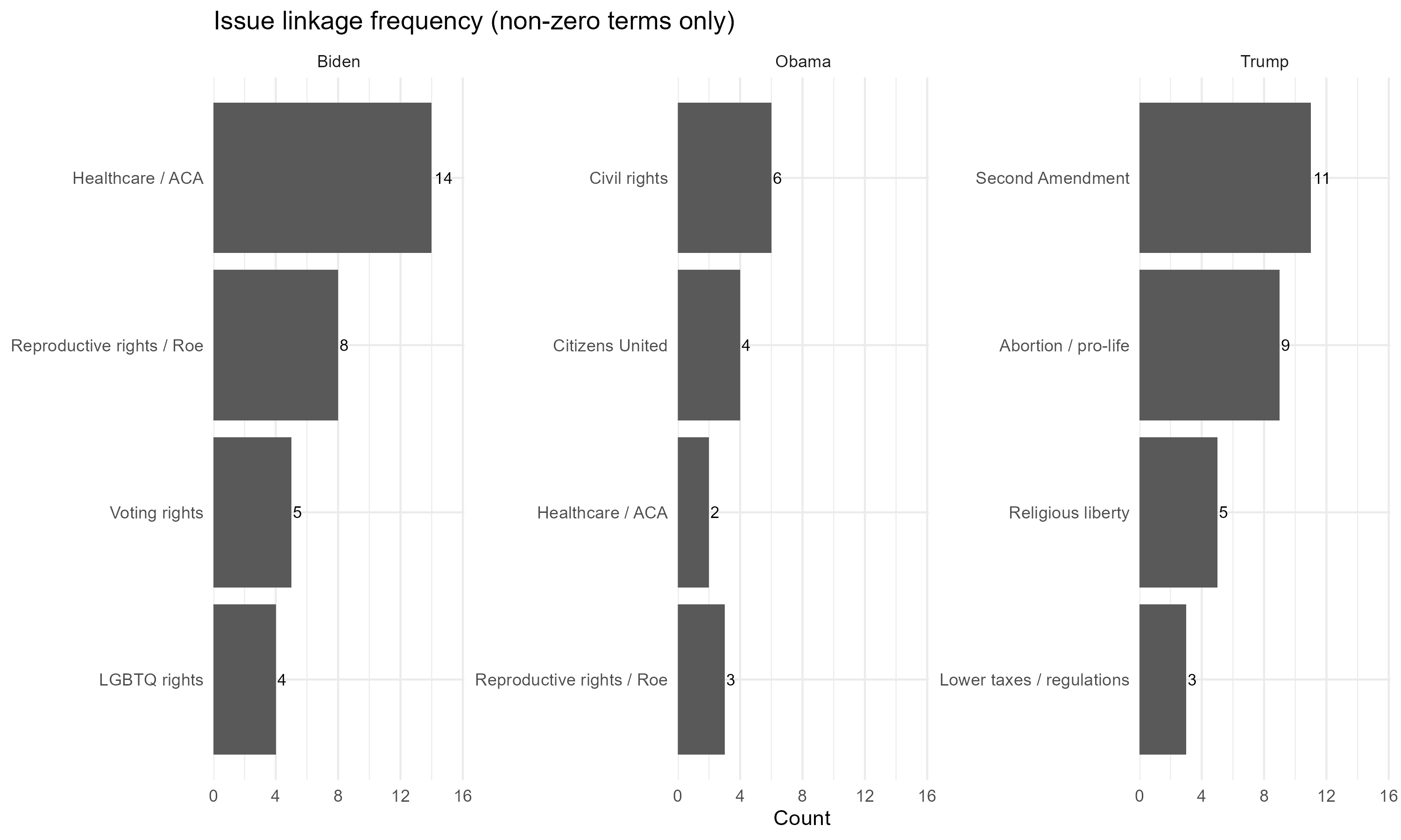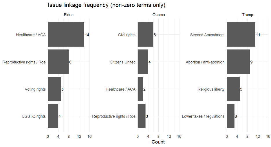 Biden showed the highest policy linkage – a great deal more than Obama – emphasizing healthcare or the ACA (14 times), reproductive rights or Roe v. Wade (eight times), voting rights (five times), and LGBTQ rights (four times). This explicit connection between judicial appointments and immediate policy consequences distinguished his approach.