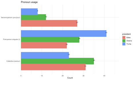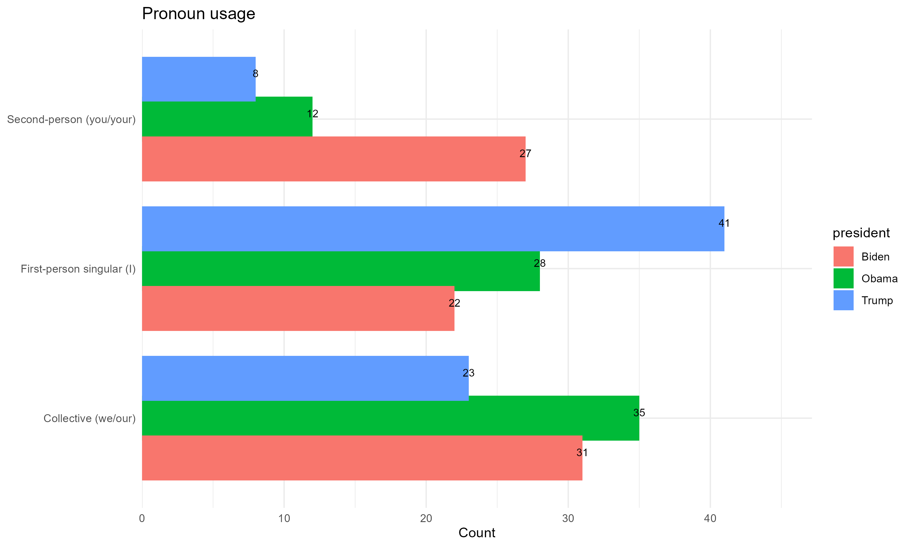 Biden employed the first-person singular (22 times), collective (31 times), and notably high second-person usage (27 times). This pattern reflected his emphasis on direct audience engagement, in an attempt to make a direct appeal to the voters.