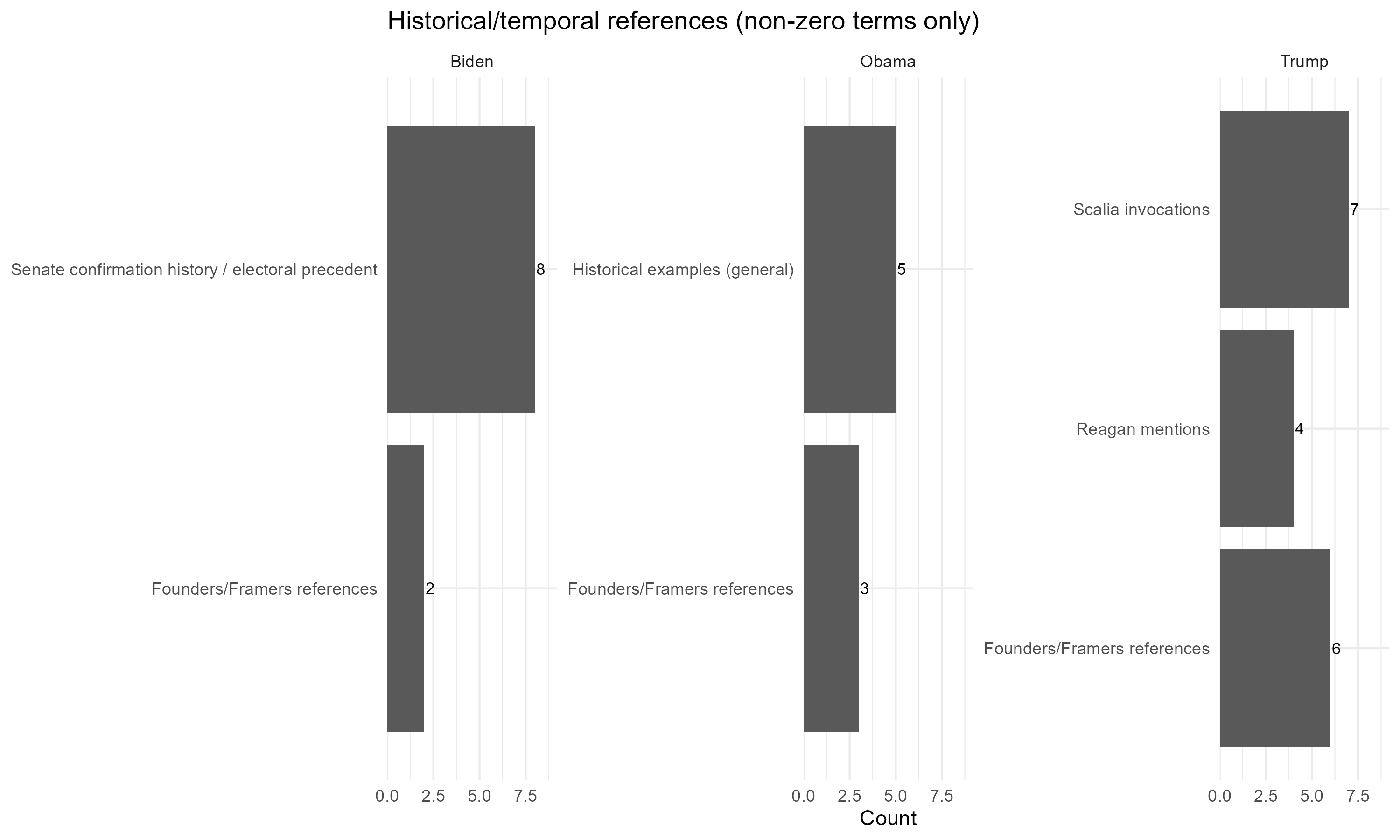 The presidents also differed in their use of historical grounding. Obama referenced the founders or framers sparingly (three times) and invoked historical examples moderately (five times, including President Ronald Reagan and Civil War era references). Biden made even fewer references to the founders (two instances) but emphasized Senate confirmation history and electoral precedent (eight examples of historical precedent) – perhaps not surprising given his long tenure in Congress. His rhetoric thus focused primarily on present-day policy implications rather than constitutional history or future projections. Trump most frequently invoked historical authority with references to the founders or framers (six times), made multiple mentions of Reagan (four times), and frequently invoked conservative justices such as Antonin Scalia (seven times). This pattern again aligned with Trump’s overall originalist framing.