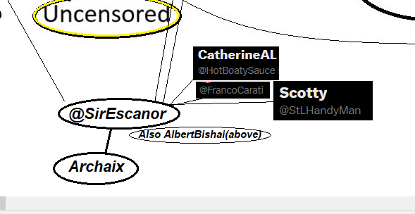 From Dustin Nemos' conspiracy diagram and the ongoing feud, the people grouped together as "Uncensored" (Sir Escanor/@EscanorReloaded, Albert Bishai, Archaix, CatherineAL/@HotBoatySauce, FrancoCarati/@FrancoCarati, Scotty/@StLHandyMan) appear connected through **active participation in the same online drama**, particularly mocking and criticizing Nemos.